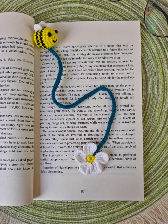 Handmade crochet bookmark with a bee, daisy, and blue stem. A sweet and playful way to mark your spot!