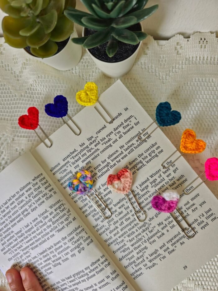 Handmade crochet paperclip bookmark with a colorful heart topper. A cute and practical way to brighten your day!