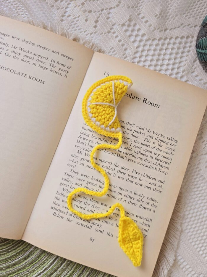 Handmade crochet bookmark with a lemon slice, wavy stem, and leafy end. Bring a fresh twist to your reading!